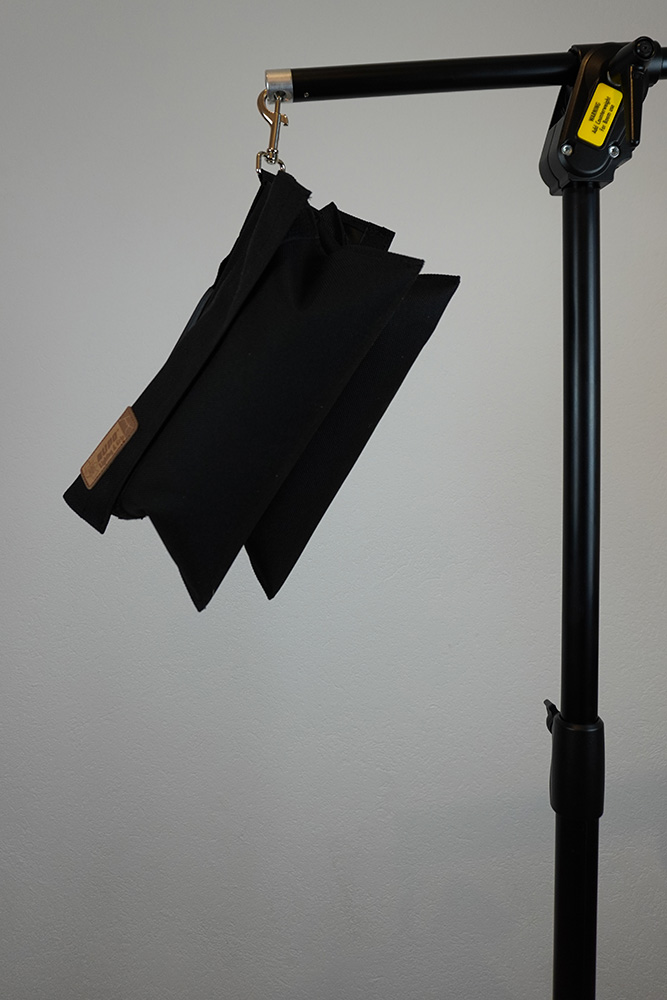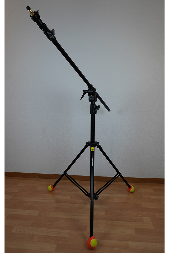 Robustes Fotostativ mit Galgenarm in massiver Bauweise, ausgestattet mit Sandsack als Gegengewicht.